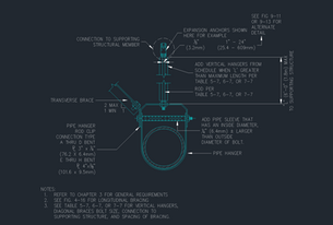 Drafted transverse & longitudinal bracing on suspended piping system to withstand seismic activity and redistribute external forces to restrict 3D movement